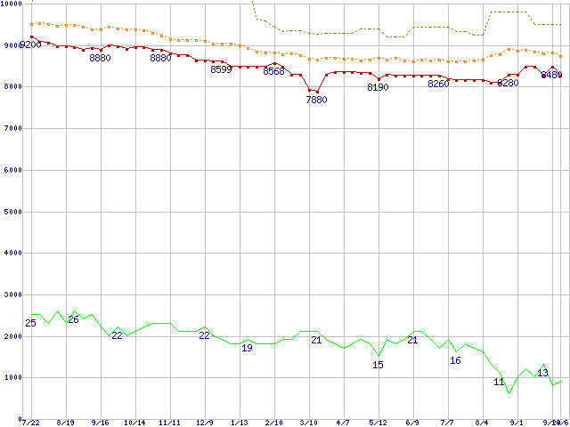 ※このグラフは過去のデータも税率5%相当に調整した税込み相当額のグラフです。 税率変更や、総額表示方式導入(2004年4月)の影響は除いています。 | | | ●凡例 | 最安値 (点線部は販売店未確認 または未調査) | 平均値 | 最高値 | ショップ数 |