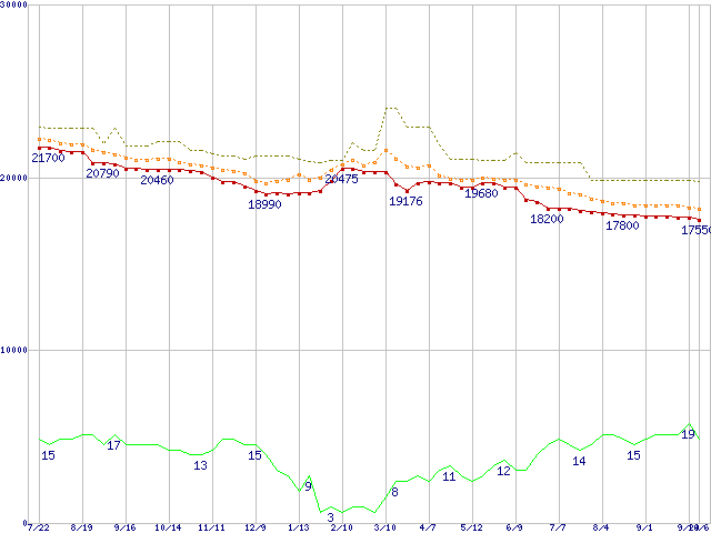 ※このグラフは過去のデータも税率5%相当に調整した税込み相当額のグラフです。 税率変更や、総額表示方式導入(2004年4月)の影響は除いています。 | | | ●凡例 | 最安値 (点線部は販売店未確認 または未調査) | 平均値 | 最高値 | ショップ数 |