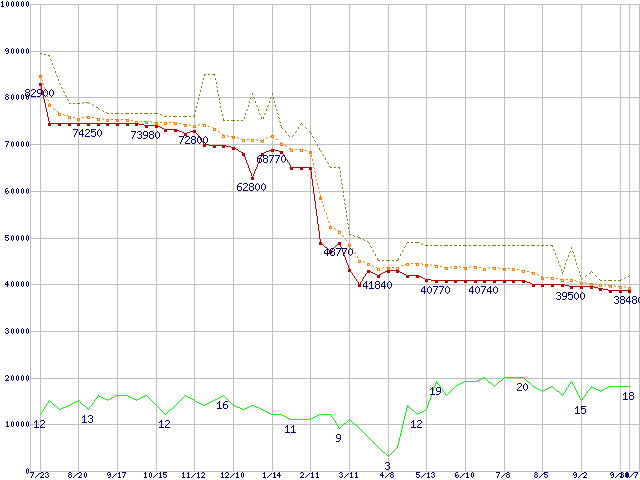 | Athlon 64 3800+ (2.4GHz,L2 512KB)の価格推移 | | | (2004年7月23日~2005年10月7日) |