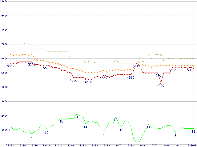 ※このグラフは過去のデータも税率5%相当に調整した税込み相当額のグラフです。 税率変更や、総額表示方式導入(2004年4月)の影響は除いています。 | | | ●凡例 | 最安値 (点線部は販売店未確認 または未調査) | 平均値 | 最高値 | ショップ数 |