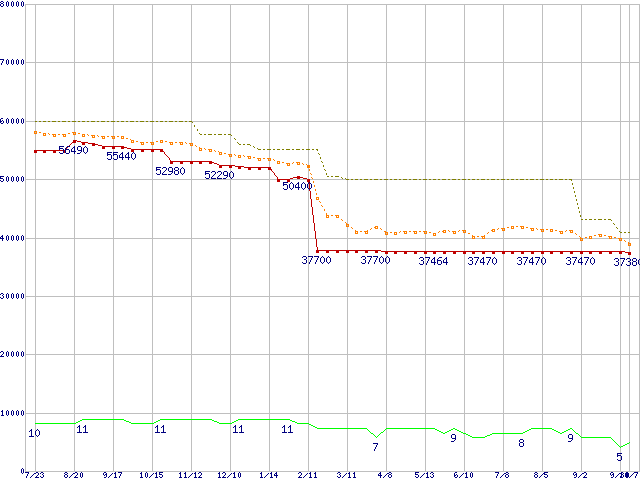 ※このグラフは過去のデータも税率5%相当に調整した税込み相当額のグラフです。 税率変更や、総額表示方式導入(2004年4月)の影響は除いています。 | | | ●凡例 | 最安値 (点線部は販売店未確認 または未調査) | 平均値 | 最高値 | ショップ数 |