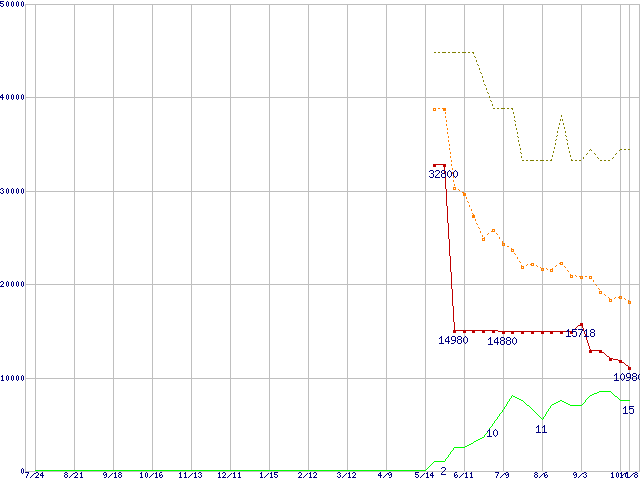 ※このグラフは過去のデータも税率5%相当に調整した税込み相当額のグラフです。 税率変更や、総額表示方式導入(2004年4月)の影響は除いています。 | | | ●凡例 | 最安値 (点線部は販売店未確認 または未調査) | 平均値 | 最高値 | ショップ数 |