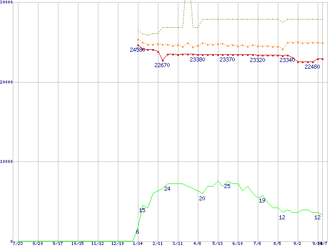 ※このグラフは過去のデータも税率5%相当に調整した税込み相当額のグラフです。 税率変更や、総額表示方式導入(2004年4月)の影響は除いています。 | | | ●凡例 | 最安値 (点線部は販売店未確認 または未調査) | 平均値 | 最高値 | ショップ数 |