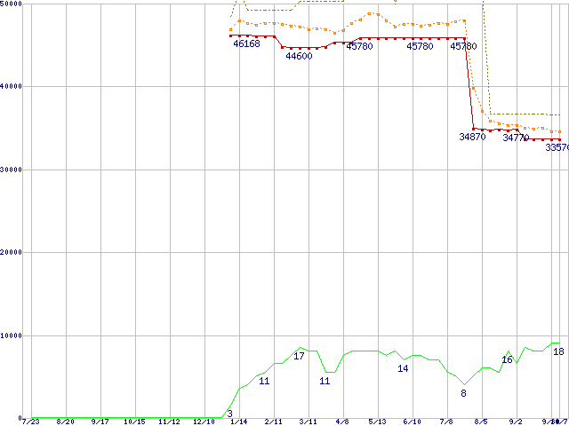 ※このグラフは過去のデータも税率5%相当に調整した税込み相当額のグラフです。 税率変更や、総額表示方式導入(2004年4月)の影響は除いています。 | | | ●凡例 | 最安値 (点線部は販売店未確認 または未調査) | 平均値 | 最高値 | ショップ数 |
