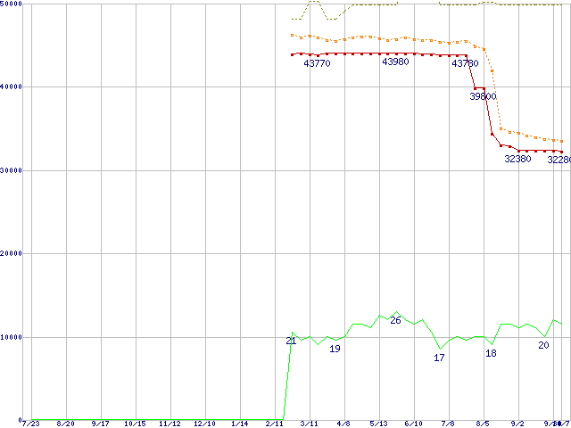 ※このグラフは過去のデータも税率5%相当に調整した税込み相当額のグラフです。 税率変更や、総額表示方式導入(2004年4月)の影響は除いています。 | | | ●凡例 | 最安値 (点線部は販売店未確認 または未調査) | 平均値 | 最高値 | ショップ数 |