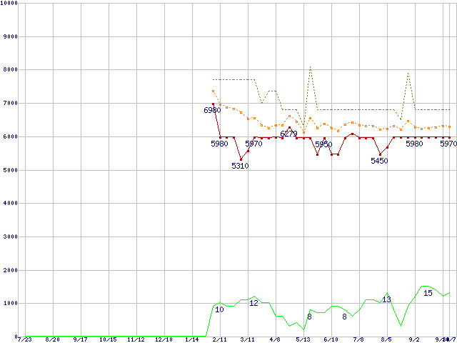 ※このグラフは過去のデータも税率5%相当に調整した税込み相当額のグラフです。 税率変更や、総額表示方式導入(2004年4月)の影響は除いています。 | | | ●凡例 | 最安値 (点線部は販売店未確認 または未調査) | 平均値 | 最高値 | ショップ数 |