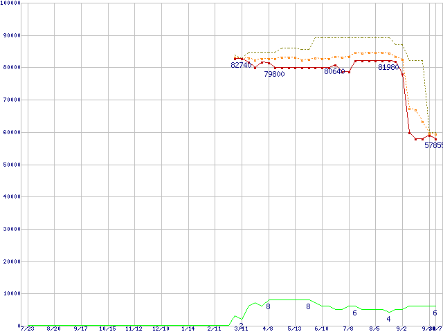 ※このグラフは過去のデータも税率5%相当に調整した税込み相当額のグラフです。 税率変更や、総額表示方式導入(2004年4月)の影響は除いています。 | | | ●凡例 | 最安値 (点線部は販売店未確認 または未調査) | 平均値 | 最高値 | ショップ数 |