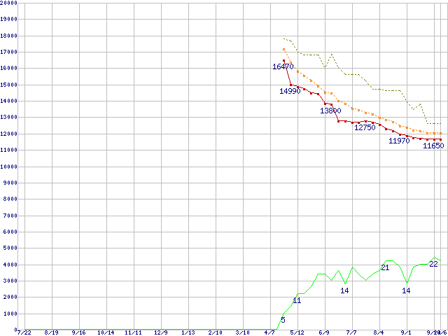 ※このグラフは過去のデータも税率5%相当に調整した税込み相当額のグラフです。 税率変更や、総額表示方式導入(2004年4月)の影響は除いています。 | | | ●凡例 | 最安値 (点線部は販売店未確認 または未調査) | 平均値 | 最高値 | ショップ数 |