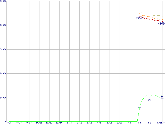※このグラフは過去のデータも税率5%相当に調整した税込み相当額のグラフです。 税率変更や、総額表示方式導入(2004年4月)の影響は除いています。 | | | ●凡例 | 最安値 (点線部は販売店未確認 または未調査) | 平均値 | 最高値 | ショップ数 |