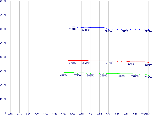 | LGA 775 (FSB 800MHz,L2 1MB×2,Dual Core,EM64T対応)の最安値推移 | | | (2005年2月25日~2005年10月7日) |