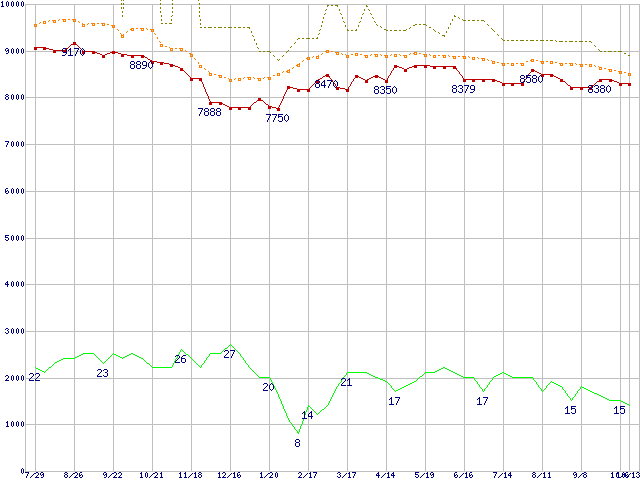 ※このグラフは過去のデータも税率5%相当に調整した税込み相当額のグラフです。 税率変更や、総額表示方式導入(2004年4月)の影響は除いています。 | | | ●凡例 | 最安値 (点線部は販売店未確認 または未調査) | 平均値 | 最高値 | ショップ数 |