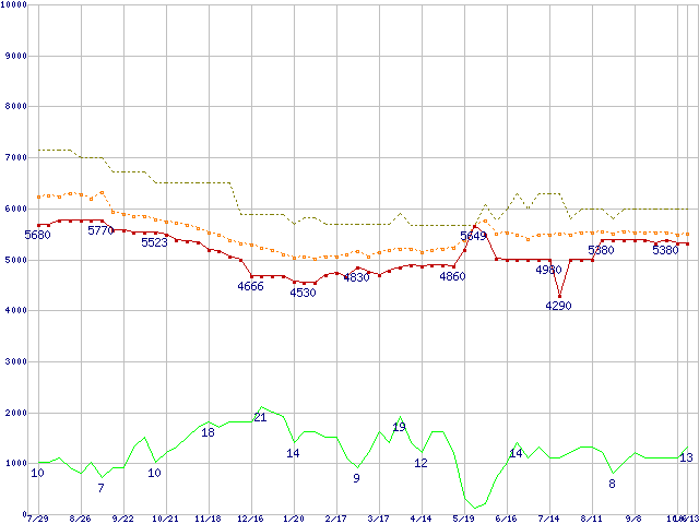 ※このグラフは過去のデータも税率5%相当に調整した税込み相当額のグラフです。 税率変更や、総額表示方式導入(2004年4月)の影響は除いています。 | | | ●凡例 | 最安値 (点線部は販売店未確認 または未調査) | 平均値 | 最高値 | ショップ数 |