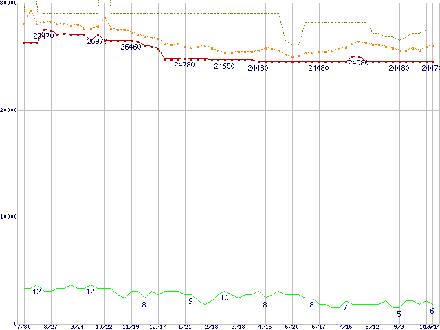 ※このグラフは過去のデータも税率5%相当に調整した税込み相当額のグラフです。 税率変更や、総額表示方式導入(2004年4月)の影響は除いています。 | | | ●凡例 | 最安値 (点線部は販売店未確認 または未調査) | 平均値 | 最高値 | ショップ数 |