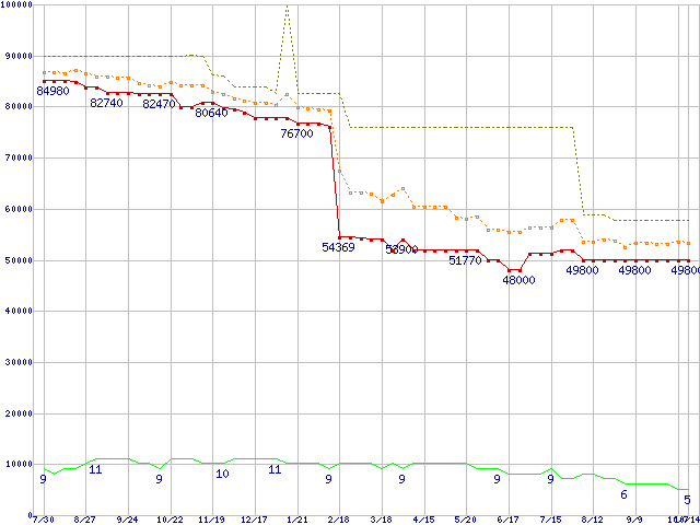 ※このグラフは過去のデータも税率5%相当に調整した税込み相当額のグラフです。 税率変更や、総額表示方式導入(2004年4月)の影響は除いています。 | | | ●凡例 | 最安値 (点線部は販売店未確認 または未調査) | 平均値 | 最高値 | ショップ数 |