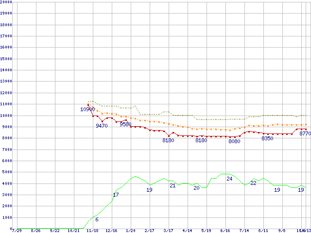 ※このグラフは過去のデータも税率5%相当に調整した税込み相当額のグラフです。 税率変更や、総額表示方式導入(2004年4月)の影響は除いています。 | | | ●凡例 | 最安値 (点線部は販売店未確認 または未調査) | 平均値 | 最高値 | ショップ数 |