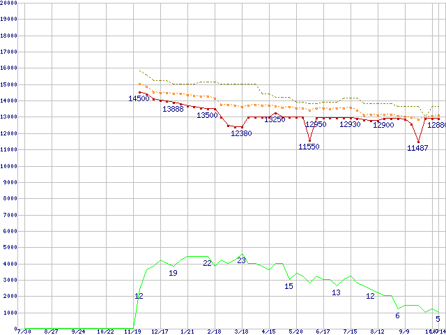 ※このグラフは過去のデータも税率5%相当に調整した税込み相当額のグラフです。 税率変更や、総額表示方式導入(2004年4月)の影響は除いています。 | | | ●凡例 | 最安値 (点線部は販売店未確認 または未調査) | 平均値 | 最高値 | ショップ数 |