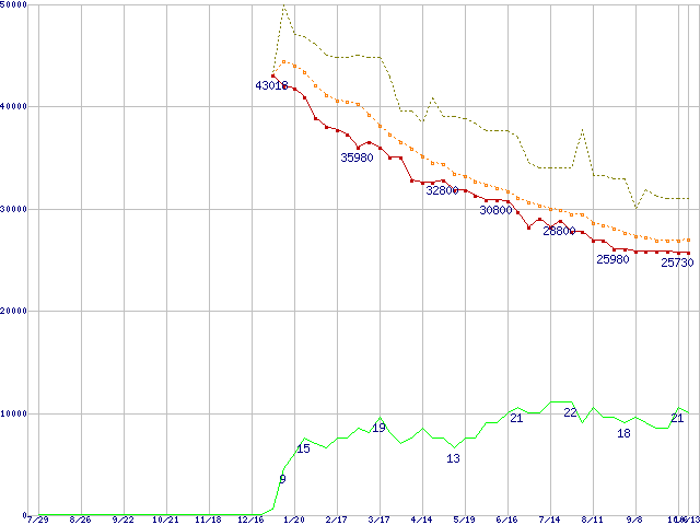 ※このグラフは過去のデータも税率5%相当に調整した税込み相当額のグラフです。 税率変更や、総額表示方式導入(2004年4月)の影響は除いています。 | | | ●凡例 | 最安値 (点線部は販売店未確認 または未調査) | 平均値 | 最高値 | ショップ数 |