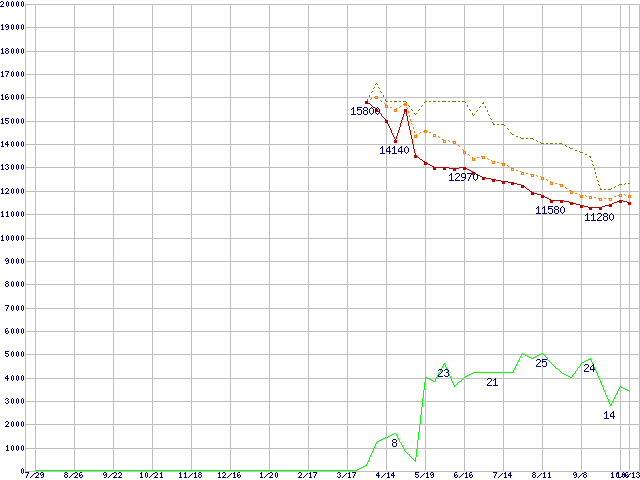 ※このグラフは過去のデータも税率5%相当に調整した税込み相当額のグラフです。 税率変更や、総額表示方式導入(2004年4月)の影響は除いています。 | | | ●凡例 | 最安値 (点線部は販売店未確認 または未調査) | 平均値 | 最高値 | ショップ数 |