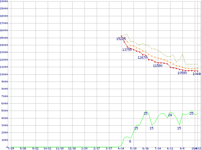 ※このグラフは過去のデータも税率5%相当に調整した税込み相当額のグラフです。 税率変更や、総額表示方式導入(2004年4月)の影響は除いています。 | | | ●凡例 | 最安値 (点線部は販売店未確認 または未調査) | 平均値 | 最高値 | ショップ数 |
