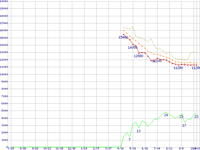 ※このグラフは過去のデータも税率5%相当に調整した税込み相当額のグラフです。 税率変更や、総額表示方式導入(2004年4月)の影響は除いています。 | | | ●凡例 | 最安値 (点線部は販売店未確認 または未調査) | 平均値 | 最高値 | ショップ数 |