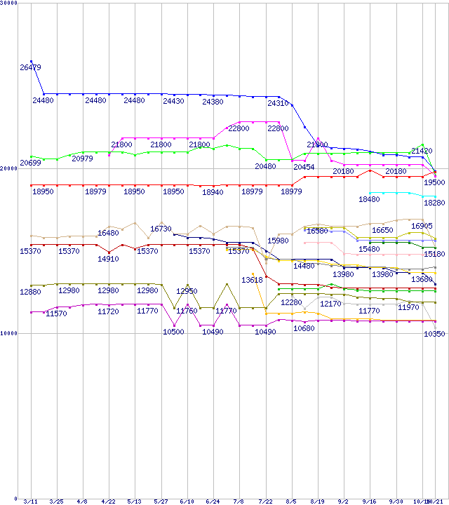 | CPU主要製品(最安値1万円~2万円未満)の最安値推移 | | | (2005年3月11日~2005年10月21日) |
