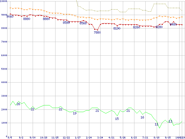 ※このグラフは過去のデータも税率5%相当に調整した税込み相当額のグラフです。 税率変更や、総額表示方式導入(2004年4月)の影響は除いています。 | | | ●凡例 | 最安値 (点線部は販売店未確認 または未調査) | 平均値 | 最高値 | ショップ数 |