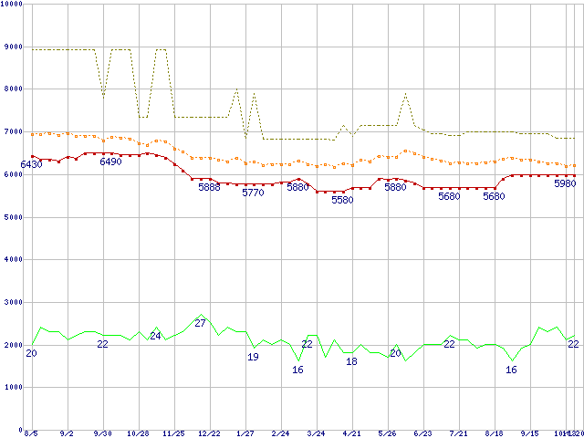 ※このグラフは過去のデータも税率5%相当に調整した税込み相当額のグラフです。 税率変更や、総額表示方式導入(2004年4月)の影響は除いています。 | | | ●凡例 | 最安値 (点線部は販売店未確認 または未調査) | 平均値 | 最高値 | ショップ数 |