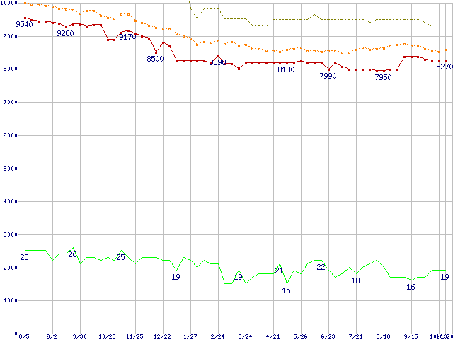 ※このグラフは過去のデータも税率5%相当に調整した税込み相当額のグラフです。 税率変更や、総額表示方式導入(2004年4月)の影響は除いています。 | | | ●凡例 | 最安値 (点線部は販売店未確認 または未調査) | 平均値 | 最高値 | ショップ数 |