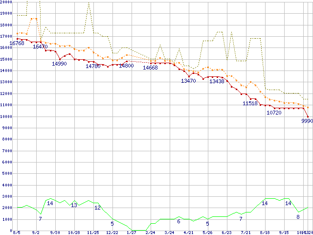 ※このグラフは過去のデータも税率5%相当に調整した税込み相当額のグラフです。 税率変更や、総額表示方式導入(2004年4月)の影響は除いています。 | | | ●凡例 | 最安値 (点線部は販売店未確認 または未調査) | 平均値 | 最高値 | ショップ数 |