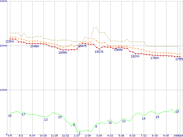 ※このグラフは過去のデータも税率5%相当に調整した税込み相当額のグラフです。 税率変更や、総額表示方式導入(2004年4月)の影響は除いています。 | | | ●凡例 | 最安値 (点線部は販売店未確認 または未調査) | 平均値 | 最高値 | ショップ数 |