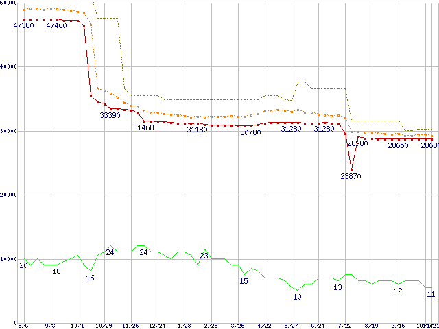 ※このグラフは過去のデータも税率5%相当に調整した税込み相当額のグラフです。 税率変更や、総額表示方式導入(2004年4月)の影響は除いています。 | | | ●凡例 | 最安値 (点線部は販売店未確認 または未調査) | 平均値 | 最高値 | ショップ数 |
