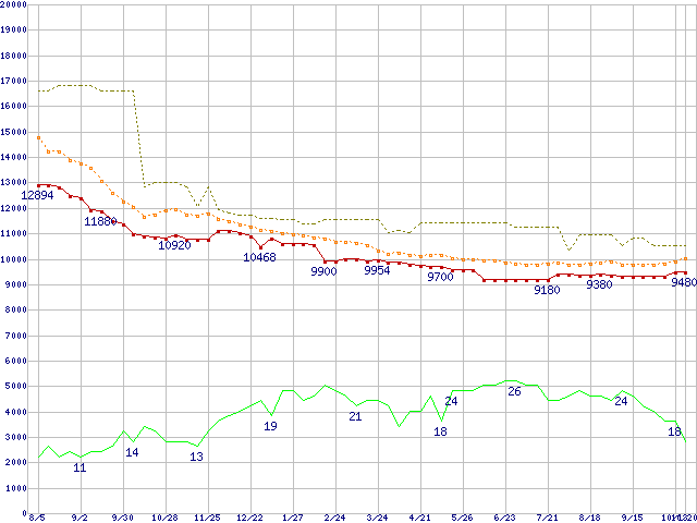 ※このグラフは過去のデータも税率5%相当に調整した税込み相当額のグラフです。 税率変更や、総額表示方式導入(2004年4月)の影響は除いています。 | | | ●凡例 | 最安値 (点線部は販売店未確認 または未調査) | 平均値 | 最高値 | ショップ数 |