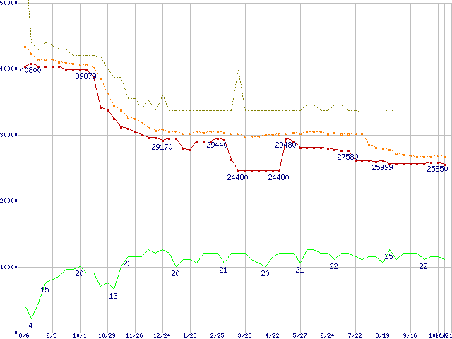 | Athlon 64 3500+ (2.2GHz,L2 512KB)の価格推移 | | | (2004年8月6日~2005年10月21日) |