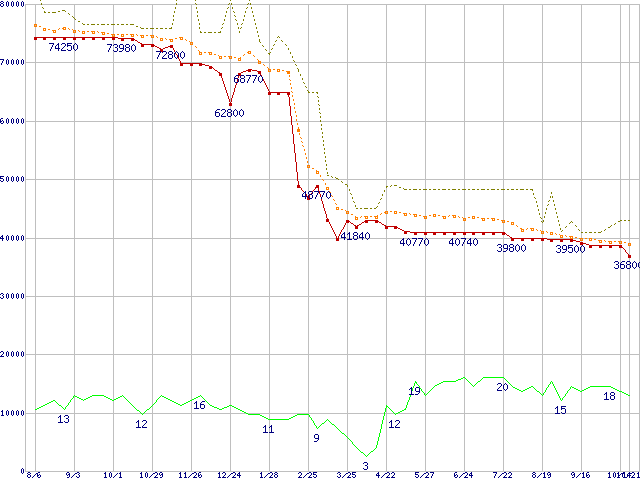 | Athlon 64 3800+ (2.4GHz,L2 512KB)の価格推移 | | | (2004年8月6日~2005年10月21日) |