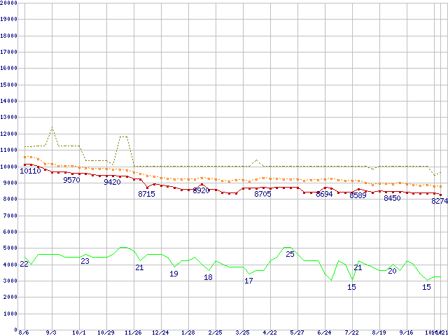 ※このグラフは過去のデータも税率5%相当に調整した税込み相当額のグラフです。 税率変更や、総額表示方式導入(2004年4月)の影響は除いています。 | | | ●凡例 | 最安値 (点線部は販売店未確認 または未調査) | 平均値 | 最高値 | ショップ数 |