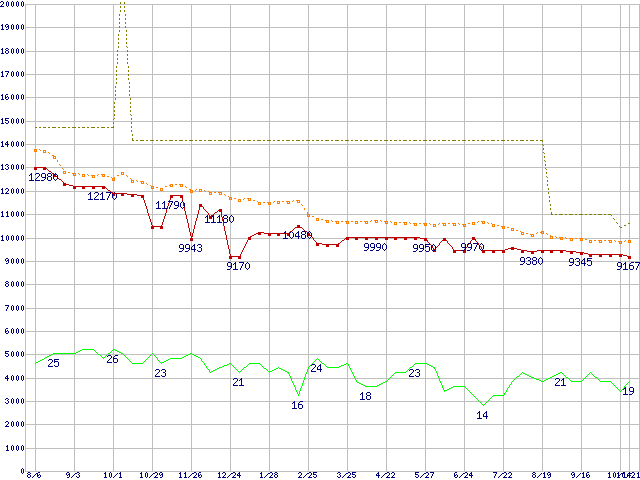 | Celeron D 335 (2.80GHz)の価格推移 | | | (2004年8月6日~2005年10月21日) |
