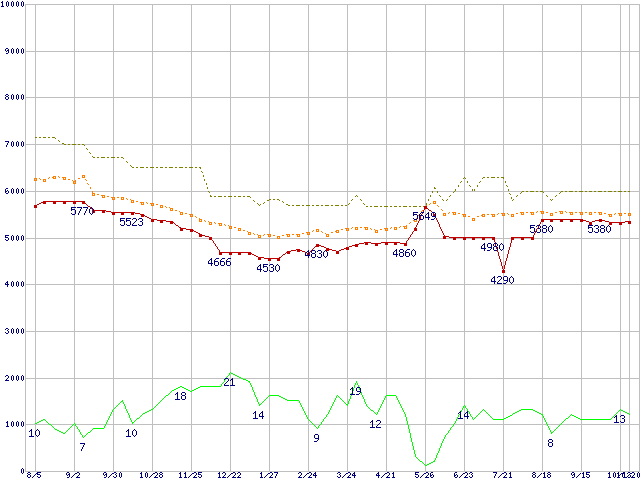 ※このグラフは過去のデータも税率5%相当に調整した税込み相当額のグラフです。 税率変更や、総額表示方式導入(2004年4月)の影響は除いています。 | | | ●凡例 | 最安値 (点線部は販売店未確認 または未調査) | 平均値 | 最高値 | ショップ数 |