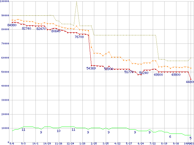 ※このグラフは過去のデータも税率5%相当に調整した税込み相当額のグラフです。 税率変更や、総額表示方式導入(2004年4月)の影響は除いています。 | | | ●凡例 | 最安値 (点線部は販売店未確認 または未調査) | 平均値 | 最高値 | ショップ数 |