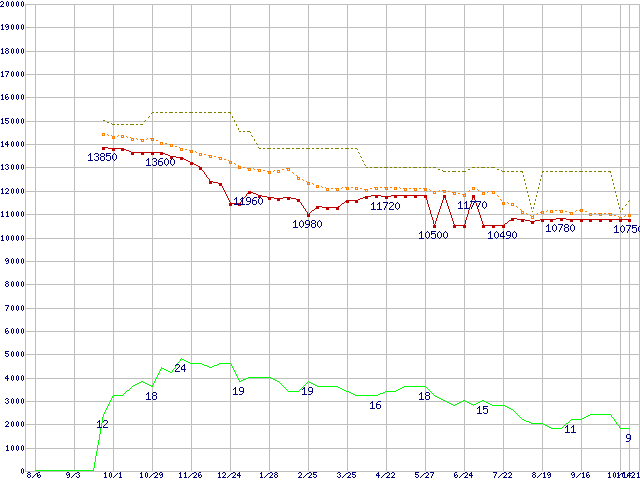 ※このグラフは過去のデータも税率5%相当に調整した税込み相当額のグラフです。 税率変更や、総額表示方式導入(2004年4月)の影響は除いています。 | | | ●凡例 | 最安値 (点線部は販売店未確認 または未調査) | 平均値 | 最高値 | ショップ数 |