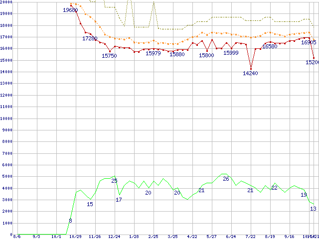 ※このグラフは過去のデータも税率5%相当に調整した税込み相当額のグラフです。 税率変更や、総額表示方式導入(2004年4月)の影響は除いています。 | | | ●凡例 | 最安値 (点線部は販売店未確認 または未調査) | 平均値 | 最高値 | ショップ数 |