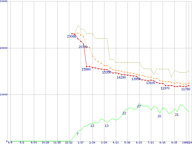 ※このグラフは過去のデータも税率5%相当に調整した税込み相当額のグラフです。 税率変更や、総額表示方式導入(2004年4月)の影響は除いています。 | | | ●凡例 | 最安値 (点線部は販売店未確認 または未調査) | 平均値 | 最高値 | ショップ数 |