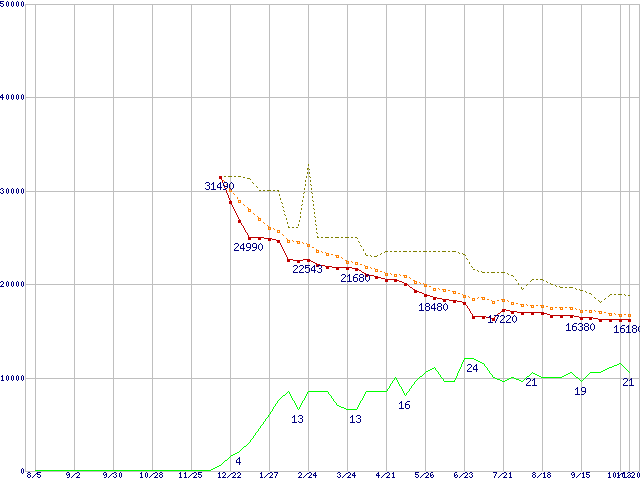 ※このグラフは過去のデータも税率5%相当に調整した税込み相当額のグラフです。 税率変更や、総額表示方式導入(2004年4月)の影響は除いています。 | | | ●凡例 | 最安値 (点線部は販売店未確認 または未調査) | 平均値 | 最高値 | ショップ数 |