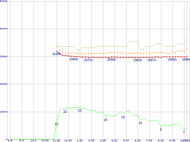 ※このグラフは過去のデータも税率5%相当に調整した税込み相当額のグラフです。 税率変更や、総額表示方式導入(2004年4月)の影響は除いています。 | | | ●凡例 | 最安値 (点線部は販売店未確認 または未調査) | 平均値 | 最高値 | ショップ数 |