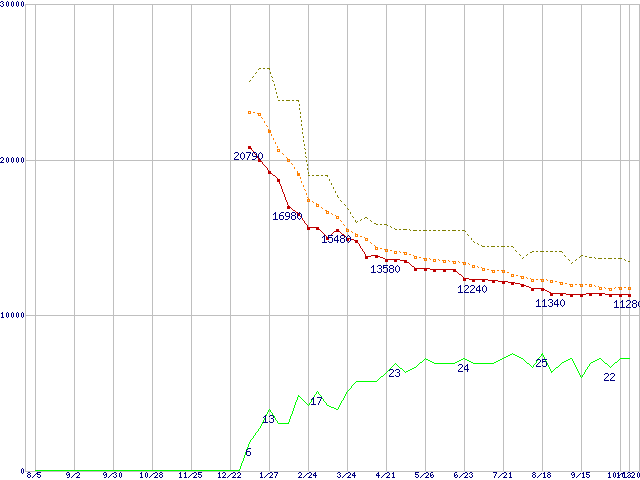 ※このグラフは過去のデータも税率5%相当に調整した税込み相当額のグラフです。 税率変更や、総額表示方式導入(2004年4月)の影響は除いています。 | | | ●凡例 | 最安値 (点線部は販売店未確認 または未調査) | 平均値 | 最高値 | ショップ数 |