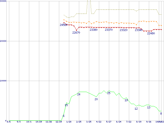 ※このグラフは過去のデータも税率5%相当に調整した税込み相当額のグラフです。 税率変更や、総額表示方式導入(2004年4月)の影響は除いています。 | | | ●凡例 | 最安値 (点線部は販売店未確認 または未調査) | 平均値 | 最高値 | ショップ数 |
