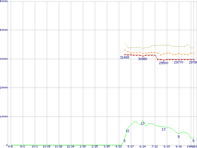 ※このグラフは過去のデータも税率5%相当に調整した税込み相当額のグラフです。 税率変更や、総額表示方式導入(2004年4月)の影響は除いています。 | | | ●凡例 | 最安値 (点線部は販売店未確認 または未調査) | 平均値 | 最高値 | ショップ数 |