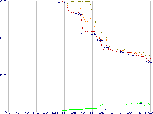 ※このグラフは過去のデータも税率5%相当に調整した税込み相当額のグラフです。 税率変更や、総額表示方式導入(2004年4月)の影響は除いています。 | | | ●凡例 | 最安値 (点線部は販売店未確認 または未調査) | 平均値 | 最高値 | ショップ数 |