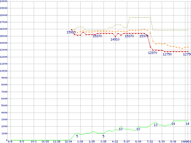 ※このグラフは過去のデータも税率5%相当に調整した税込み相当額のグラフです。 税率変更や、総額表示方式導入(2004年4月)の影響は除いています。 | | | ●凡例 | 最安値 (点線部は販売店未確認 または未調査) | 平均値 | 最高値 | ショップ数 |