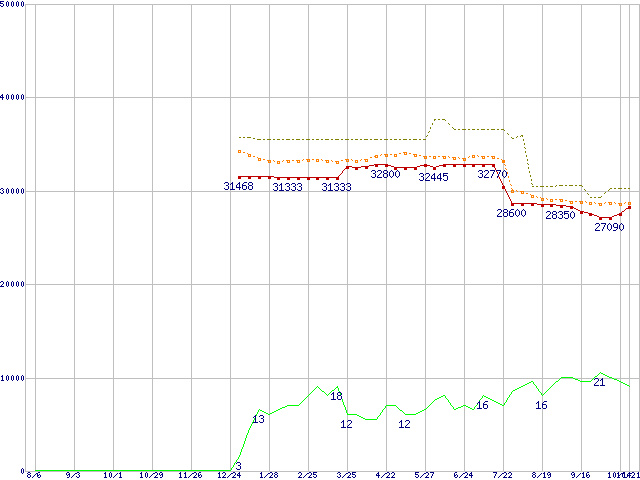 ※このグラフは過去のデータも税率5%相当に調整した税込み相当額のグラフです。 税率変更や、総額表示方式導入(2004年4月)の影響は除いています。 | | | ●凡例 | 最安値 (点線部は販売店未確認 または未調査) | 平均値 | 最高値 | ショップ数 |