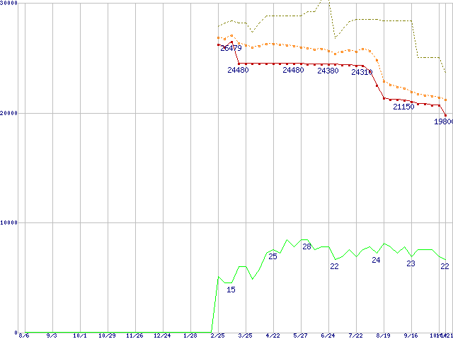 ※このグラフは過去のデータも税率5%相当に調整した税込み相当額のグラフです。 税率変更や、総額表示方式導入(2004年4月)の影響は除いています。 | | | ●凡例 | 最安値 (点線部は販売店未確認 または未調査) | 平均値 | 最高値 | ショップ数 |
